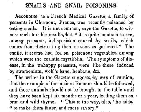 Laigue lauded the medicinal properties of snails and limaces (slugs), noting that they were beneficial for curing stomach illnesses. He wrote: