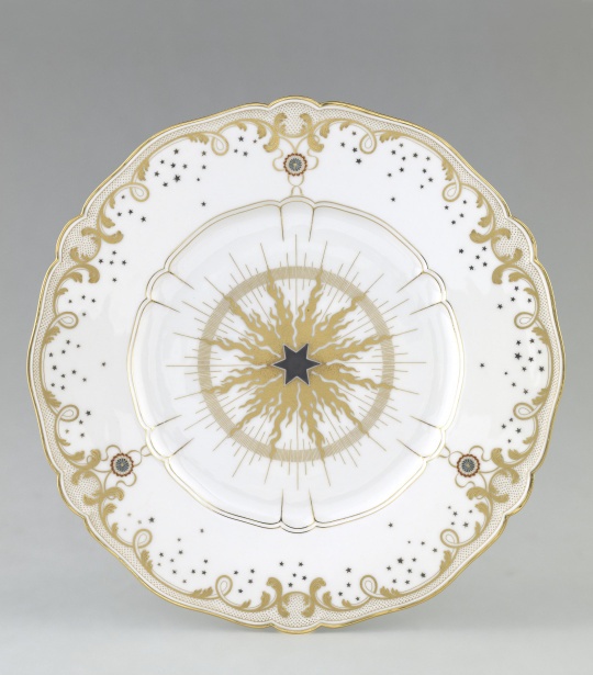 The table is set for 18, using the original Sèvres Pimprenelle china dinner service. This beautiful service was specially commissioned by the state for formal use in the Élysée Palace, the home of French presidents. Produced between 1906 and 1909 by the Manufacture de Sèvres, it was based on drawings by Henri Dujardin-Beaumetz, then undersecretary of state for fine arts, whose art nouveau design symbolises the republic.