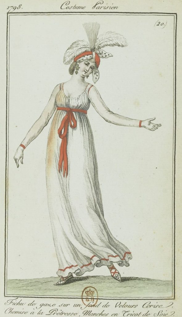 Les Merveilleuses, or marvellous women, were so named for their completely outrageous fashion style and behaviour in the dying days of the 18th century. Diaphanous and floaty fabrics were draped Grecian style over near-nude bodies, leather sandals criss-crossed naked legs and bare toes modelled the latest style in golden rings. Neo-classical was definitely in, and women were determined to express their freedom through fashion no matter the weather; it’s perhaps no coincidence that deaths amongst young women related to pneumonia and other respiratory illnesses were higher than usual at the time.