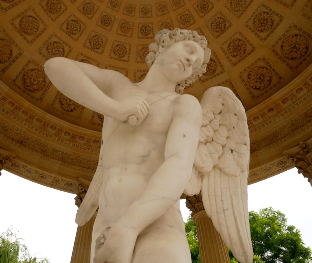 But the statue has a history. The one in Marie Antoinette’s Temple of Love is a copy, fashioned at the same time as the folly was constructed. The original, in 1750, was made for the palace of Versailles and placed in the centre of the Hercules Salon, but was deemed to be far too outrageous, not having the usual simpering or angelic poses one expected of Cupid. the god of Love.