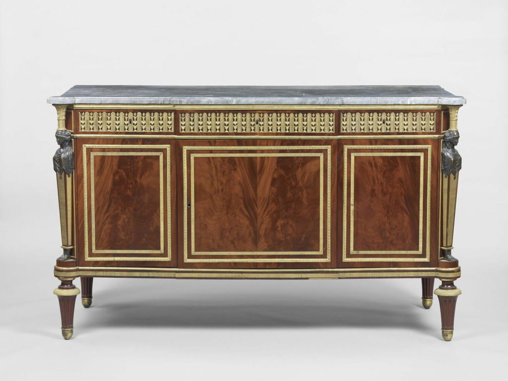 Historical inventories, letters and court records have given us much detail as to how Madame Thierry’s bedroom would have looked. In 1787, Thierry ordered two superb mahogony chests of drawers for this bedroom, with simple lines, gilded trim and an antique patina, as was the latest in furniture. One of these original commodes can be seen at the Louvre museum, as shown in the image above.