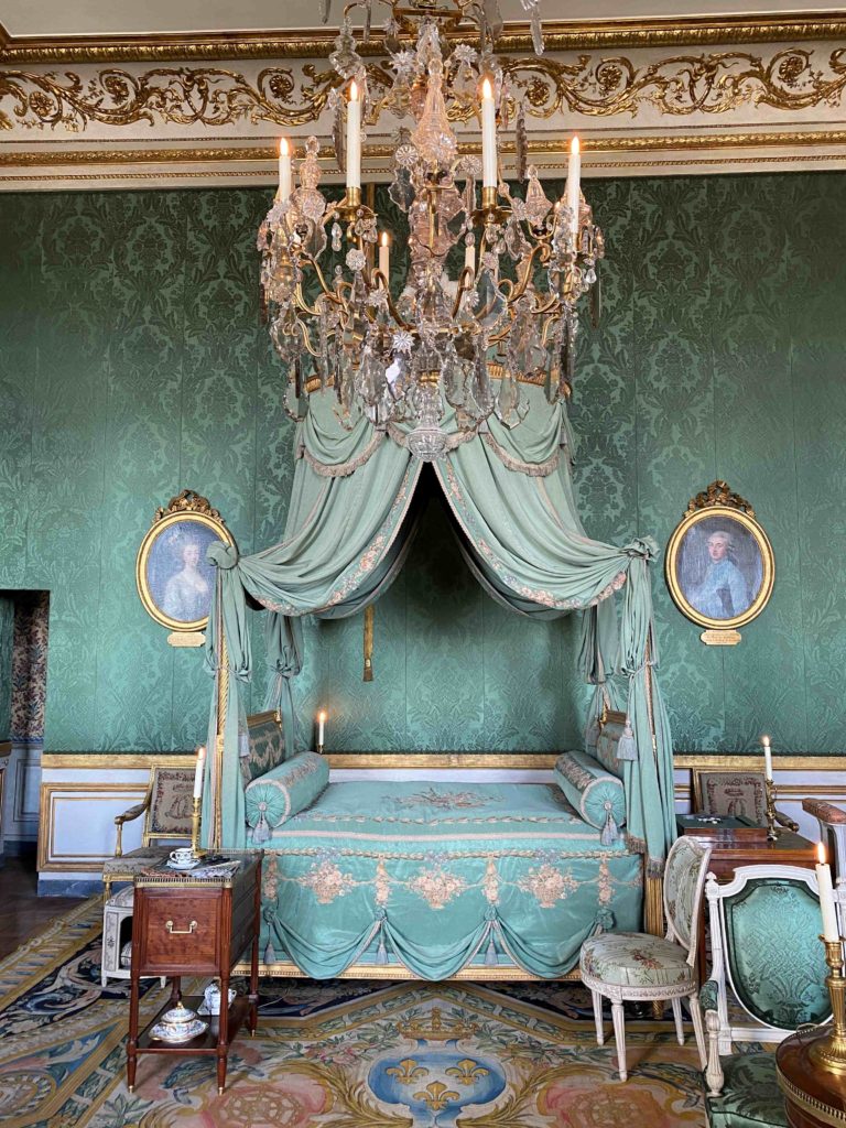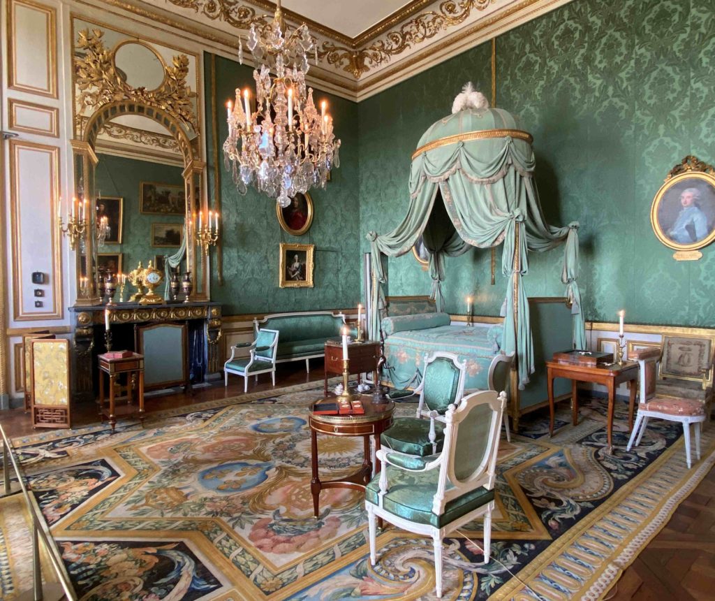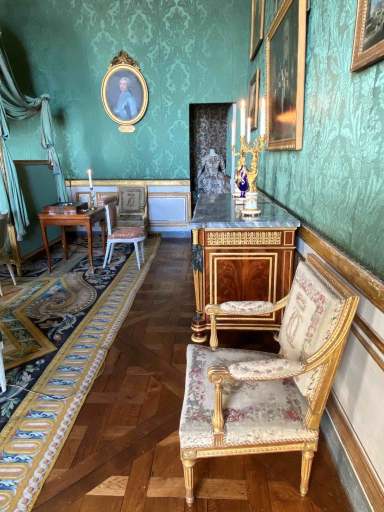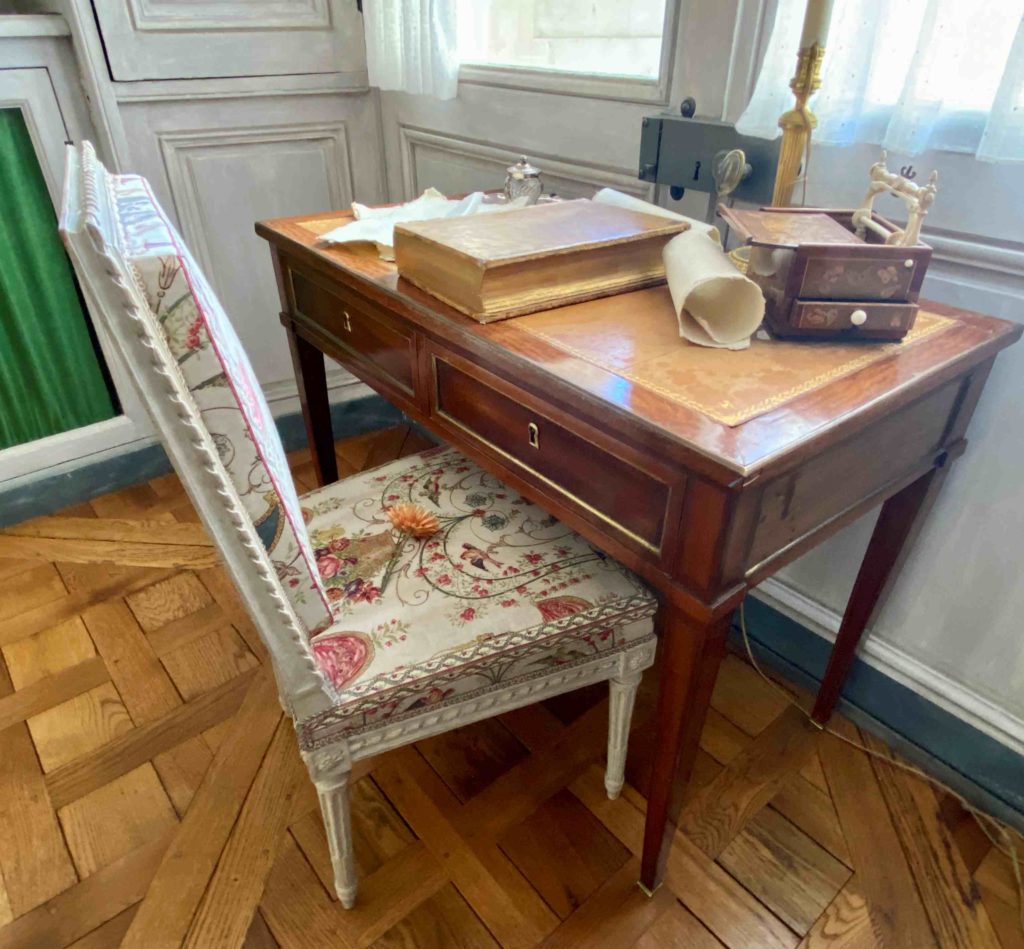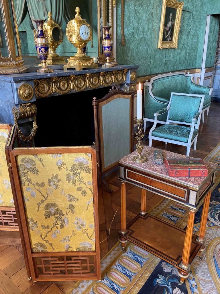 But it was a bedroom all the same, and the objects on display give a glimpse into the world of Madame Thierry. On the bedside table, if you look closely, you can see the treasured fan which was a gift from the queen Marie Antoinette. Perhaps she soothed a crying grandchild in the chair next to the bed, took tea next to the fireplace protected by its silk firescreen, or played a game and gossiped with a close friend whilst sitting at the small table on green damask chairs. Letters were written in the small library which adjoined her room, overlooking the colonnaded terrace, with her armchairs painted white and upholstered in toile de Jouey. It seems like a happy place.