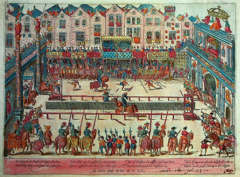 The Hôtel des Tournelles met its doom on a sunny day in June, 1559. Henri II was struck in the eye during a jousting tournament held at the palace, and died painfully from his wounds 10 days later. His queen, Catherine de Medici, who had long wanted to rid herself of the Hôtel and build elsewhere, ordered the house to be destroyed and the land sold. Much of the nobility rejoiced, for the palace was close to a sewer and apart from the strong and unpleasant odours, outbreaks of disease were common. There is no trace of the Tournelles remaining today, and in its place now is the elegant Place des Vosges.